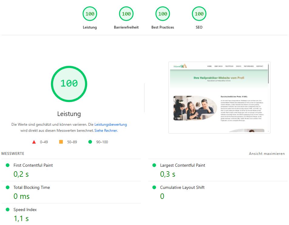 Eine Website wie jede Andere, mit nur dem kleinen Unterschied, dass dieses schlichte Design mit perfektem Code geschaffen wurde, ohne Baukasten wie Elementor. Die Website lädt in deutlich unter 1 Sekunde und ist damit schneller als 99.8% aller Websites der Branche.