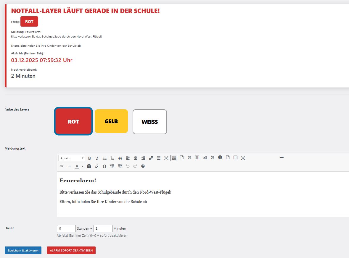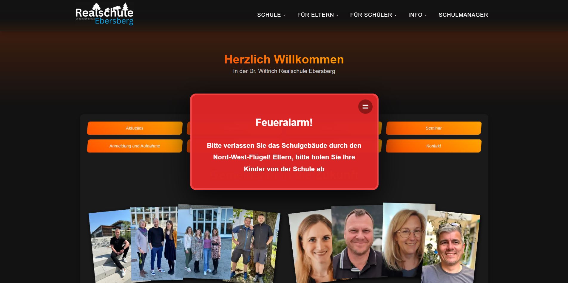 Website kann per 1-Klick-System in den Panik-Modus versetzt werden für eine vom Direktor vorbestimmte Zeitspanne. Alle Farben der Website ändern sich zu Rot-Orange und Verlaufen optisch schwankend für ideale Aufmerksamkeit. Ein großer Layer zeigt die Meldung an, die der Direktor wünscht. Ideal für Feueralarm, Wetterfrei oder Terrorsituationen. Optional kann die Schnittstelle des Schulmanagers angeschlossen werden, um alle Eltern gleichzeitig zu informieren.